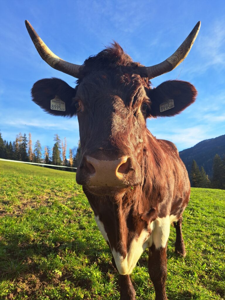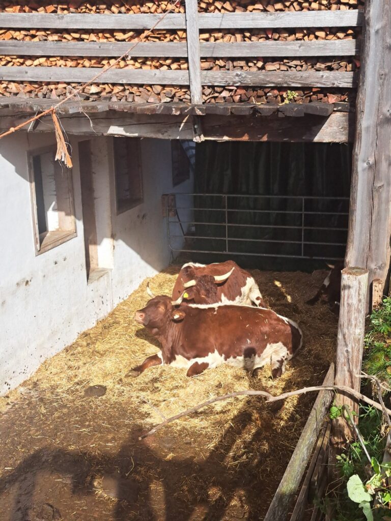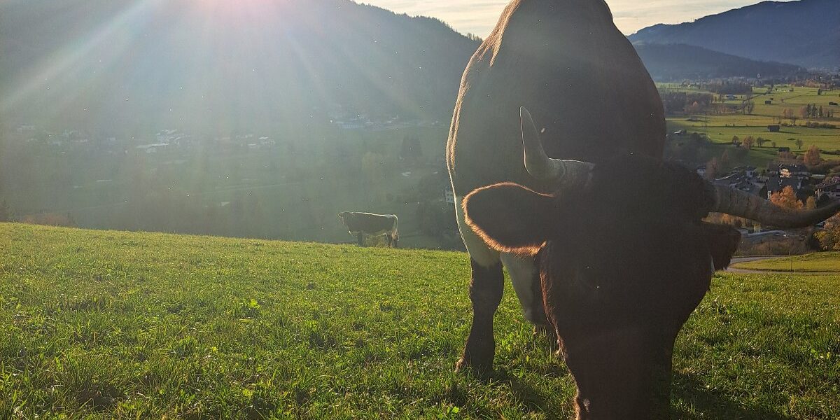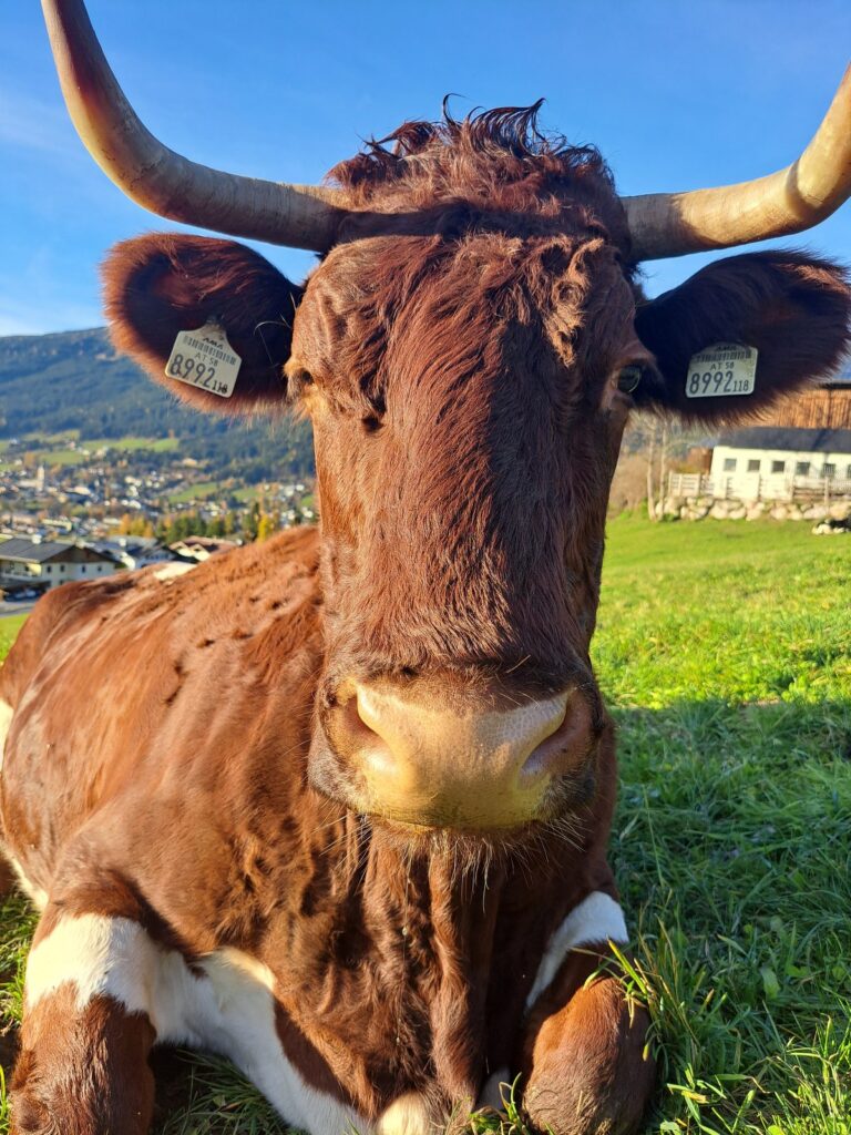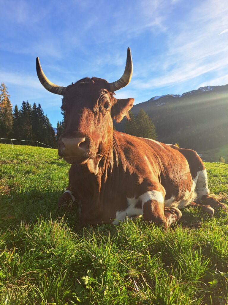 Auch wenn das Gras nicht mehr nachwächst, so genießen die Rinder doch die Zeit auf der Weide. Gefressen wird meist im Stall schon das Heu, die Sonne genossen wird draußen in der Wiese. In Kontakt mit der Erde liegt es sich halt doch am besten.