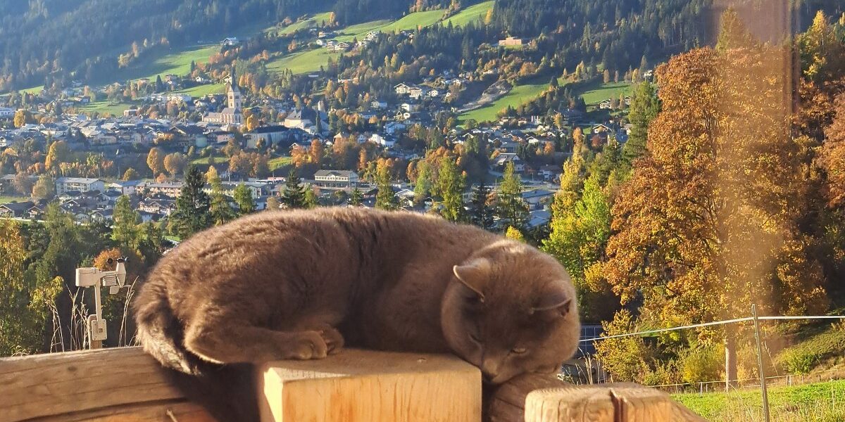Bei Regen ziehen sich die Katzen gerne in den Stall zurück, doch bei Sonne genießen sie es draußen total. So schöne warme Herbstsonnenstrahlen sind halt …