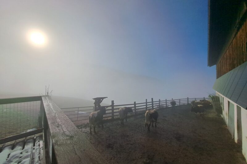 Auch wenn das Gras nicht mehr nachwächst, so genießen die Rinder doch die Zeit auf der Weide. Gefressen wird meist im Stall schon das Heu, …